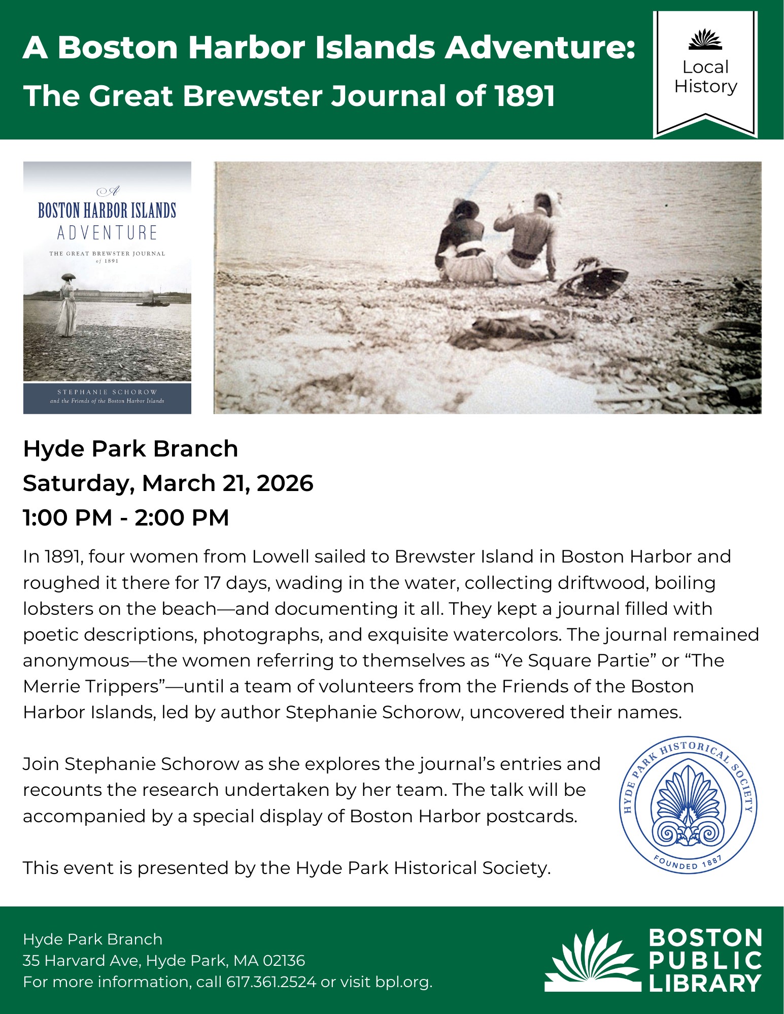 Stephanie Schorow, author of non-fiction books about Boston will share the adventures of the “Merrie Trippers”, four women from Lowell who journaled their 17 days on Great Brewster Island in 1891. There will be time for questions and to view postcards of Boston Harbor and its islands.