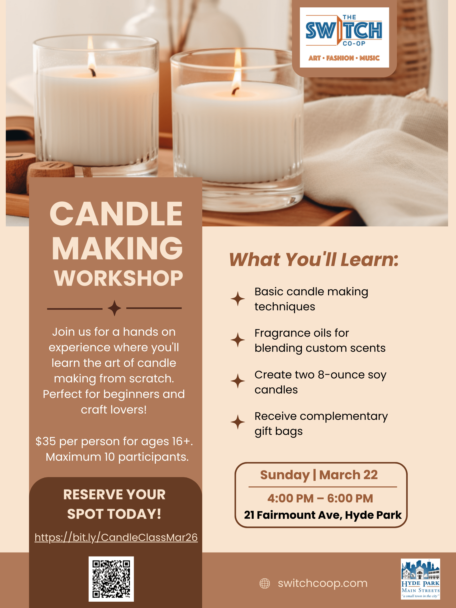 Join us for a hands on experience where you'll learn the art of candle making from scratch. Perfect for beginners and craft lovers! $35 per person for ages 16+. […]